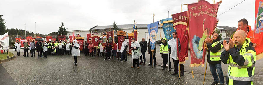 - Gode venner! Dere skal vite at dere har mange bak dere i denne kampen. Og denne skal vinnes. Vi aksepterer rett og slett ikkje at arbeidstakere i 2017 skal stå uten tariffavtale når de ønsker det, sa forbundsleder Jørn Eggum under en appell og fanemarkering for streiken de ansatte ved Norse Production på Skageneset ved Sotra har for å få opprettet tariffavtale.