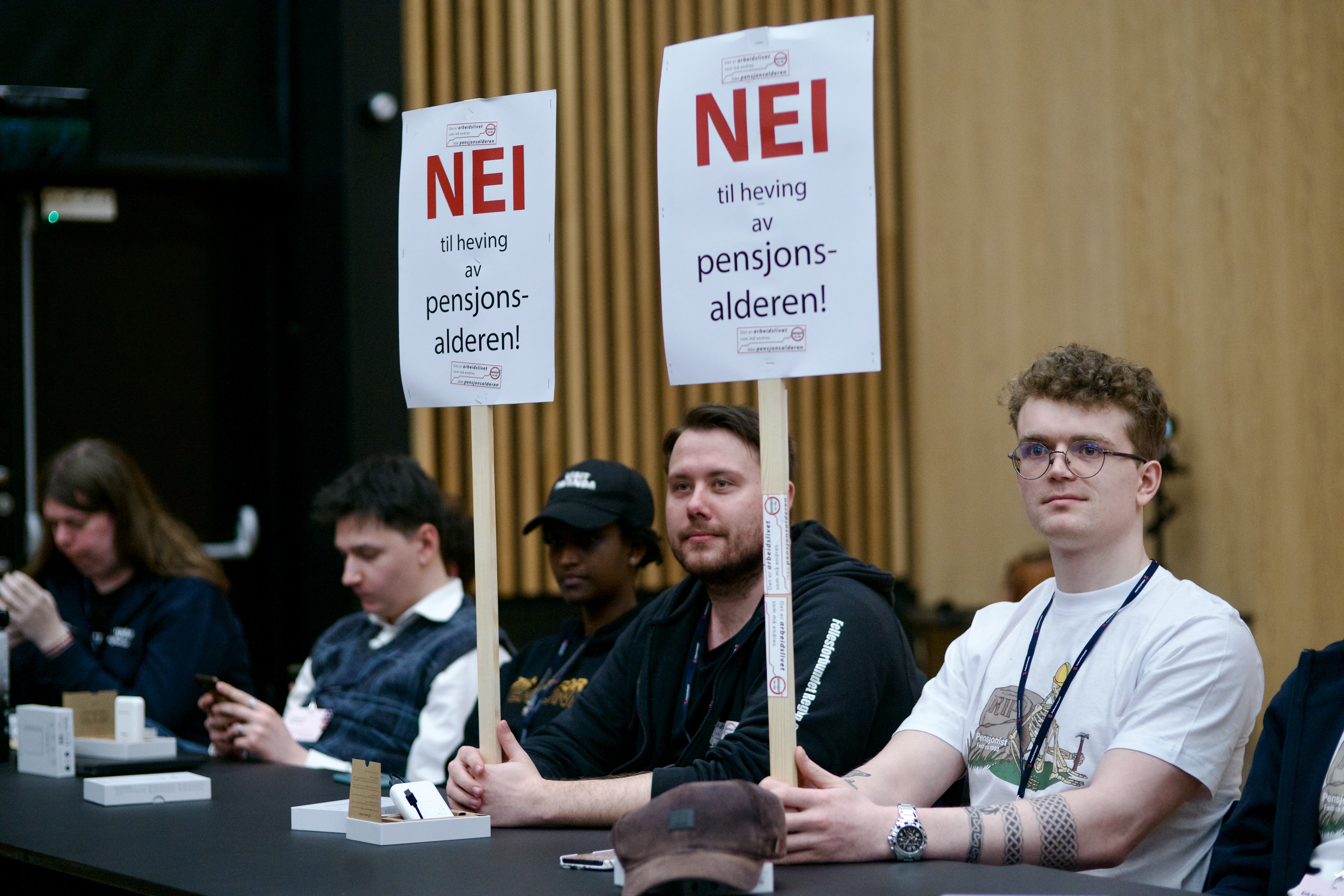 De som fikk mest oppmerksomhet var en liten gruppe som løftet plakater med «nei til heving av pensjonsalderen» under Jørns tale. Selv om pensjonsalderen ligger langt frem, er dette et tema som engasjerer de unge i Fellesforbundet.