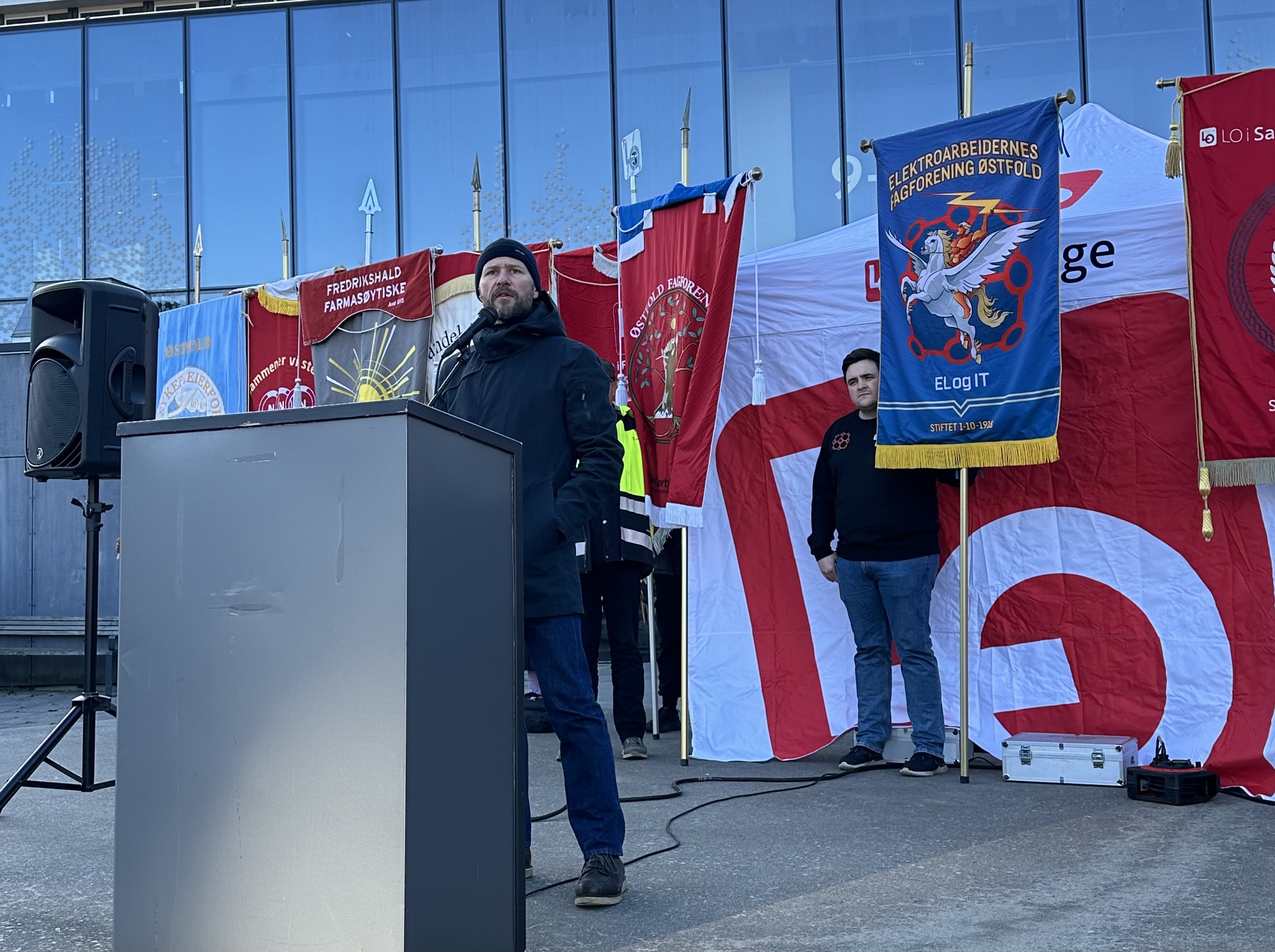 Lørdag var forbundssekretær Joachim Espe i Sarpsborg for å markere motstand mot nedleggelse av yrkesfagskolene Borg og Greåker.