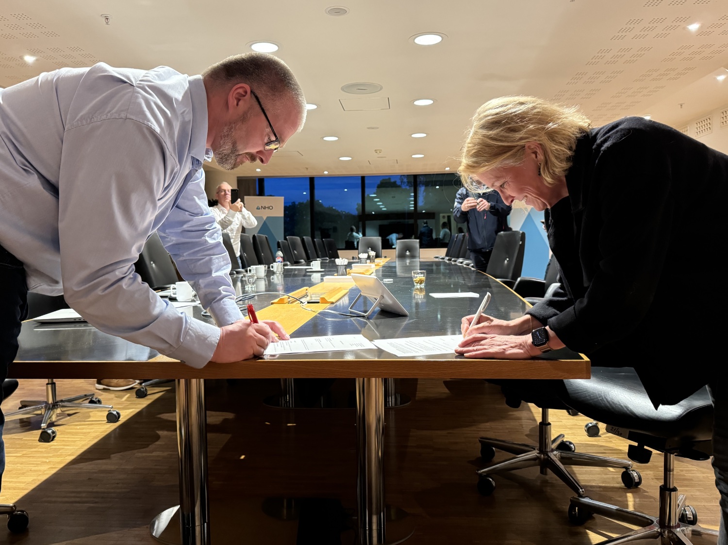 Forhandlingsleder Endre Lie fra Fellesforbundet og Camilla Schrader Roander fra NHO Mat og Drikke signerer møteprotokollen etter at de kom til enighet etter en lang dag med forhandlinger.